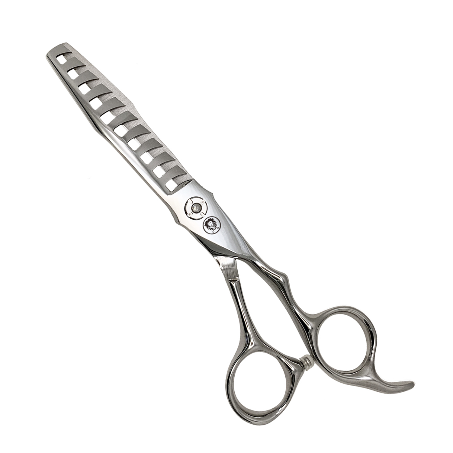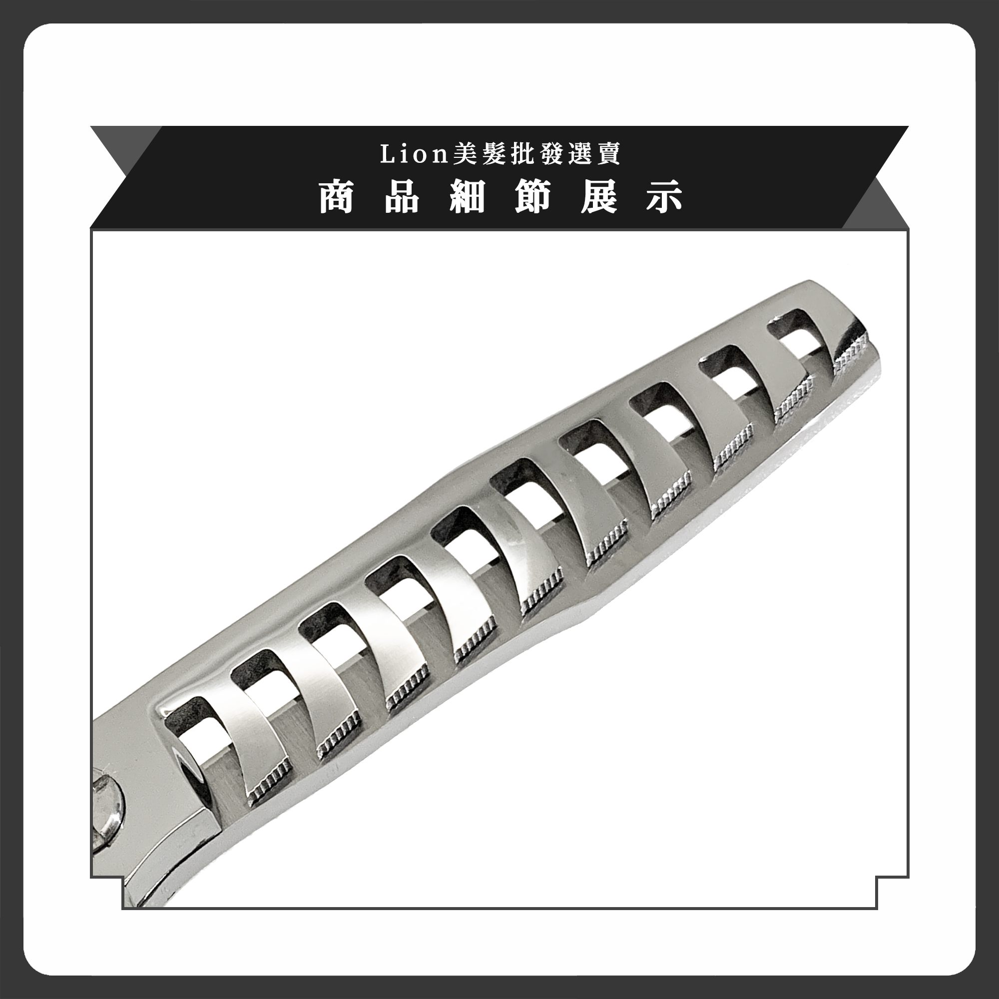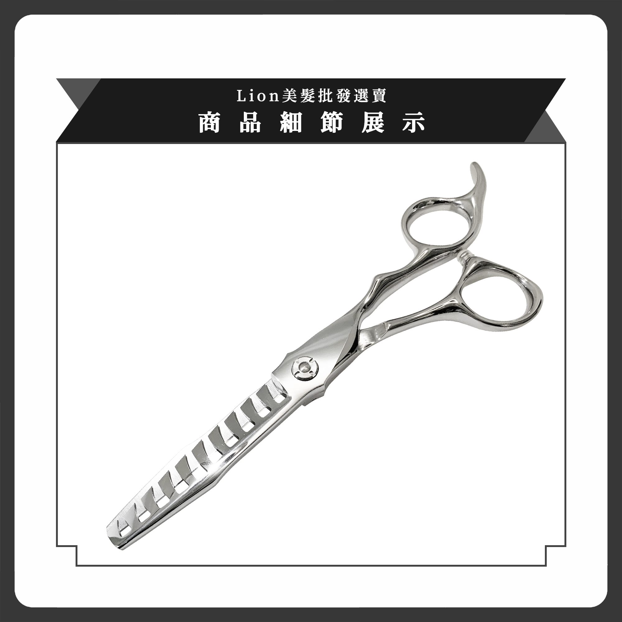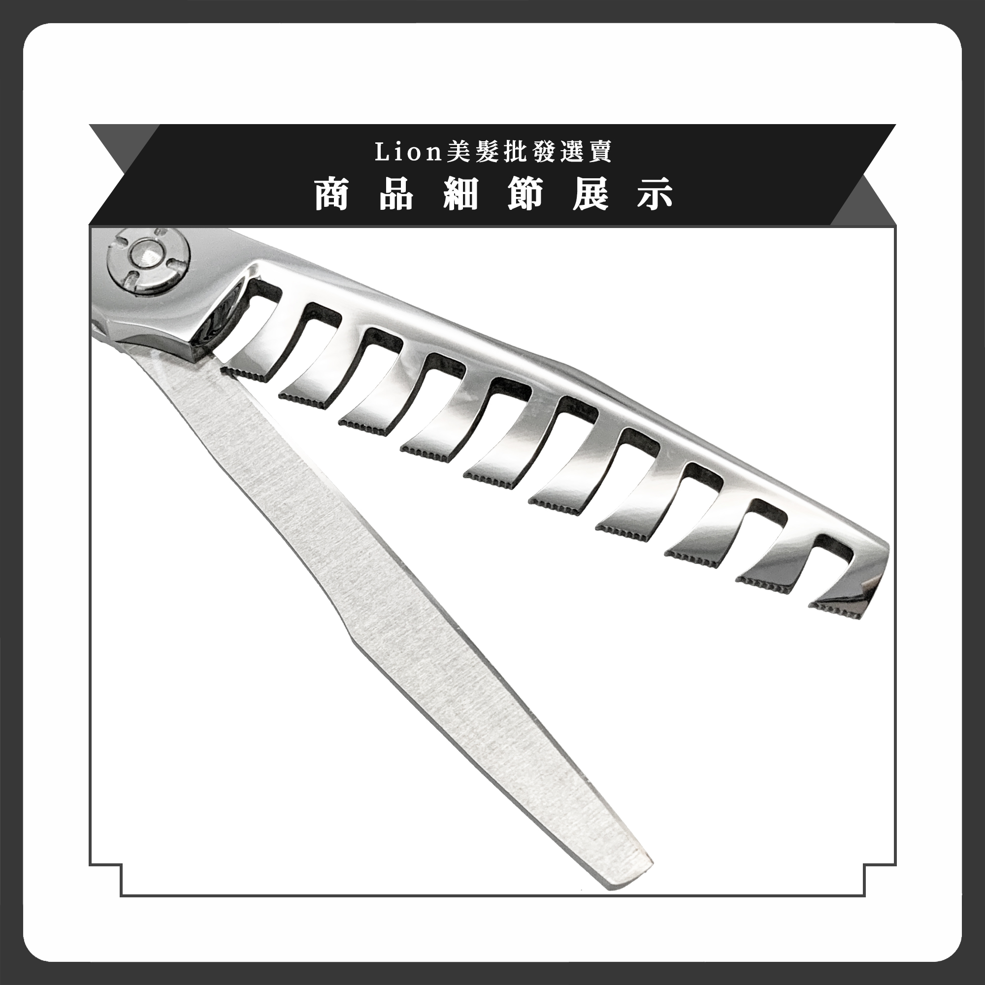 LION Scissors SP50P 寬斜鋸齒的設計能讓頭髮沿齒面自然下刀,裁剪效果自然柔順,不易留下生硬刀痕,打造較於一般魚骨剪更加無痕打薄效果。